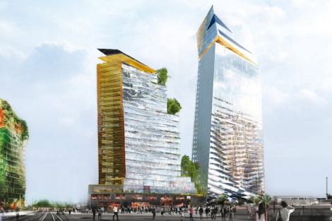 Los edificios albergarán oficinas, comercios e incluso un hotel en un total de 110.000 metros cuadrados.Las Duo -así han sido bautizadas- estarán forradas de vidrio y serán ligeramente inclinadas, como las Kio españolas. Comenzarán a levantarse en 2014 y el último piso vea la luz cuatro años y 500 millones de euros después.